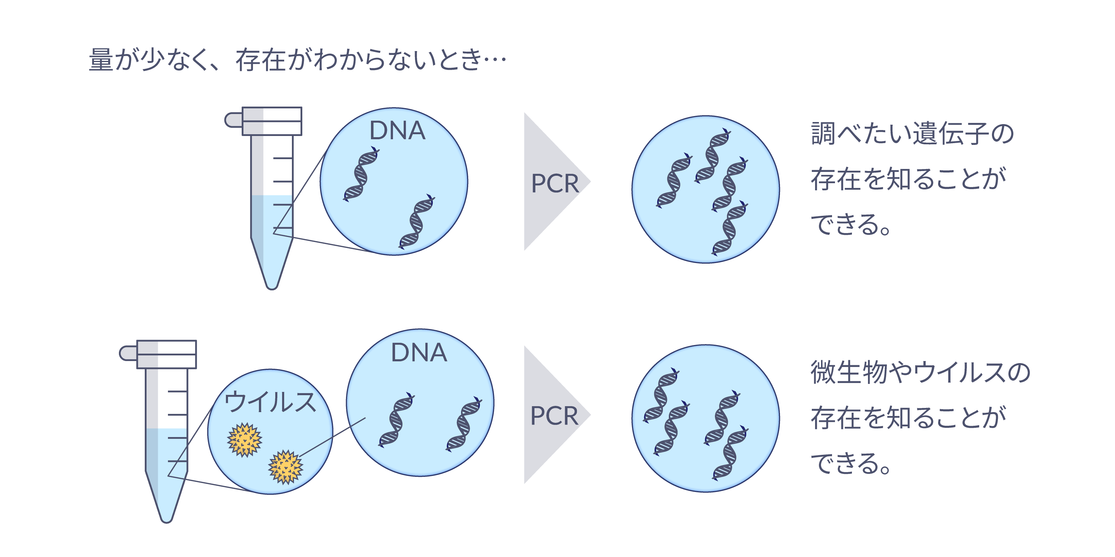 PCRとは、ごく微量のDNAを大量に増やす手法のことで、「微生物」や「ウイルス」などや、「調べたい遺伝子配列」が存在しているかどうかを知ることができます。